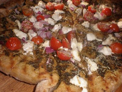 topped with pesto, goat cheese, tomatoes, and onions, then finished on the grill